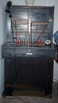 In June, 1998 I got a cord board! It was bought for me and delivered by a very dear friend. "Does it work?" you ask. Kind of. I have our phone lines connected to it, and you can plug into them and hear a very faint dial tone or disconnect using the levers, but you cannot dial and there is no talking circuit. Besides external power, this board was made to be used in conjunction with a (albeit very antiquated) PBX switching system.
