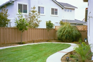 In the after shot you can see our trees. The two outer ones are Cupaniopsis anacardioides (Carrotwood), and the inner one is a Podocarpus gracilior. These are evergreen trees and will not change much throughout the year. What is not depicted here is that just behind the fence is another house with second story windows facing our yard, from which these trees will provide some privacy. The pampas grass on the right of the picture is really green, not brown as shown. A trellis with blooming jasmine heightens the low fence.